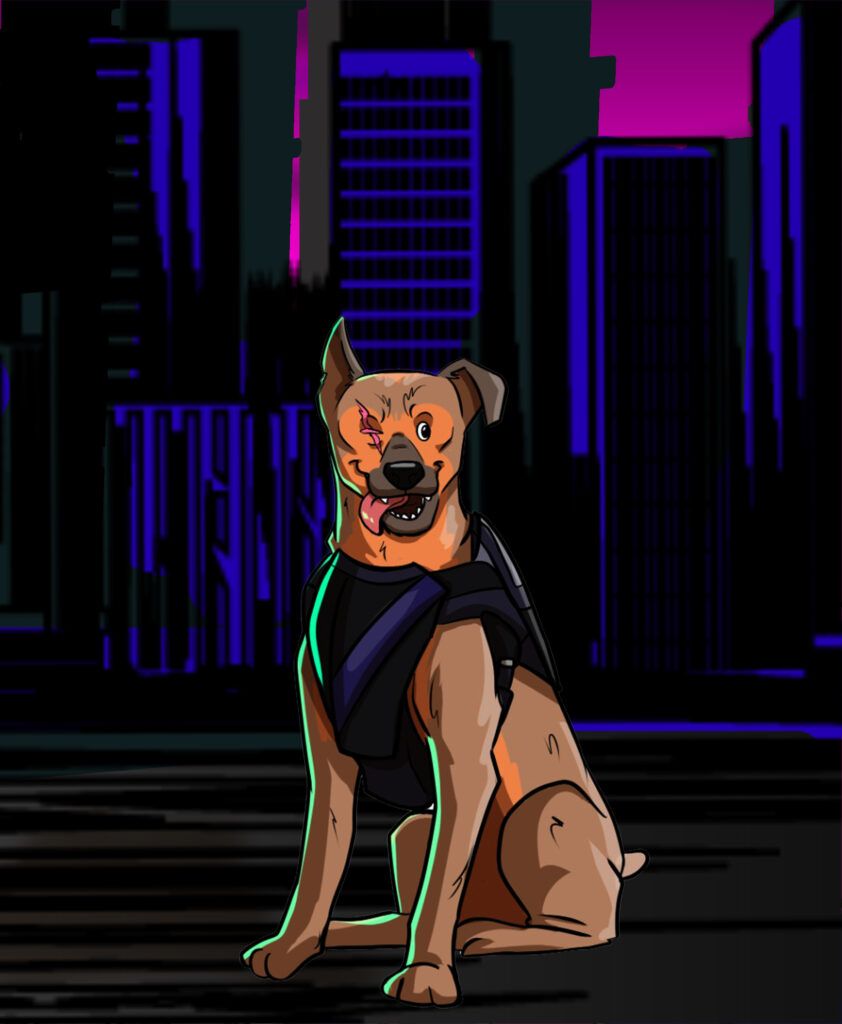Completa el equipo, un perro entrenado el cual fue dado de baja de un equipo Navy Seal tras perder un ojo en una explosion durante un entrenamiento.